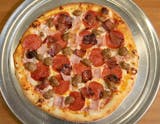 Pizza sauce, mozzarella cheese, pecorino cheese, ham, pepperoni, sausage, and bacon, bell pepper, onion, jalapeno.